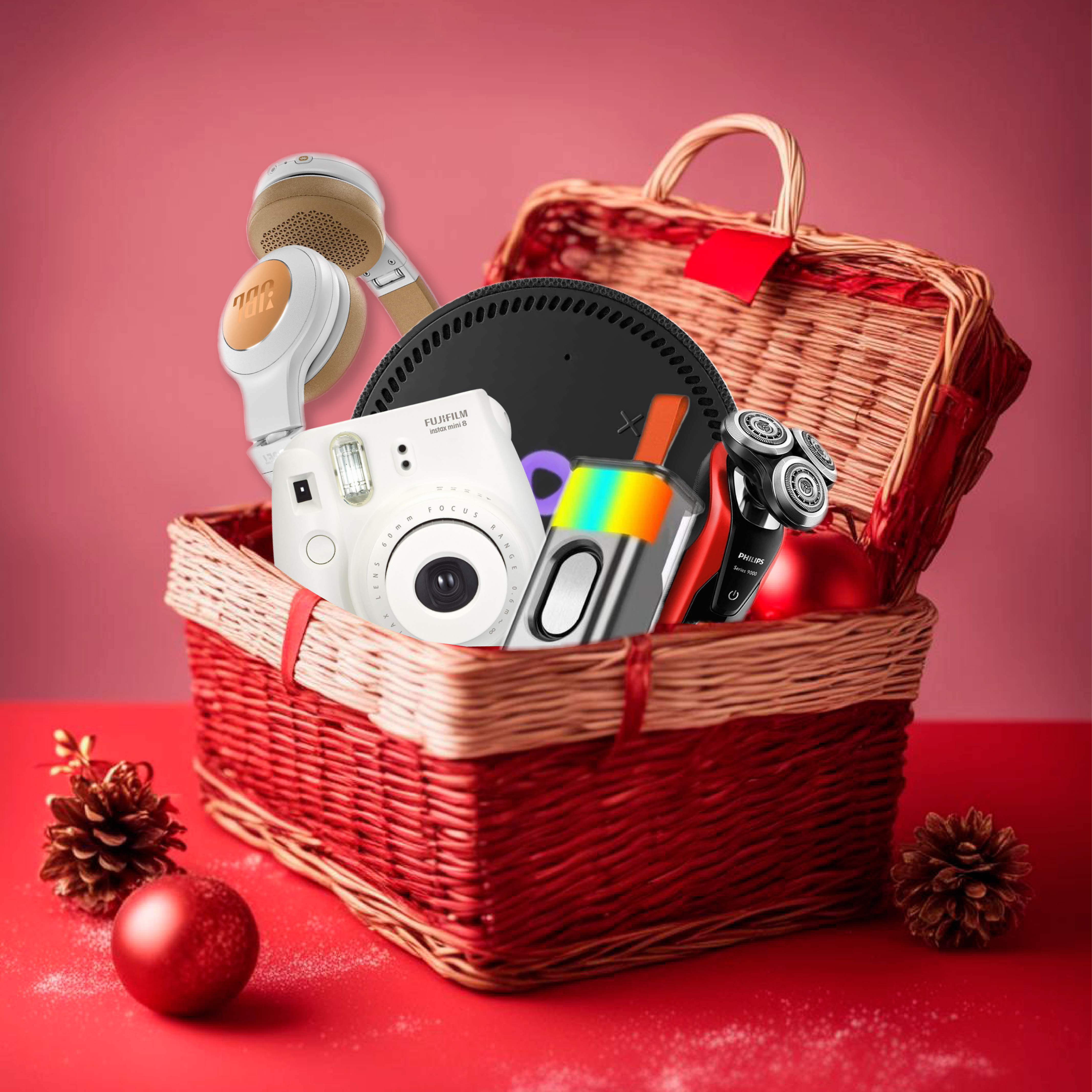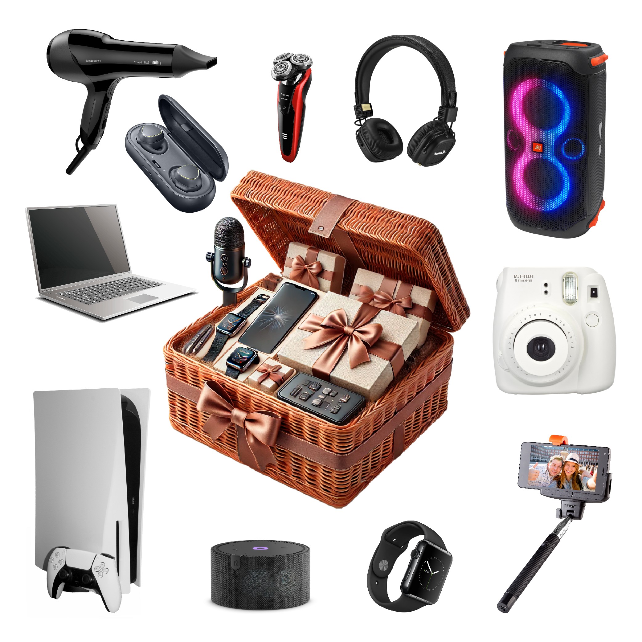 В наборе вы найдете самые крутые новинки техники. Кроме этого у нас много подарков для вас, в каждом наборе мы гарантируем наушники, смарт-часы и гирлянду-штору!